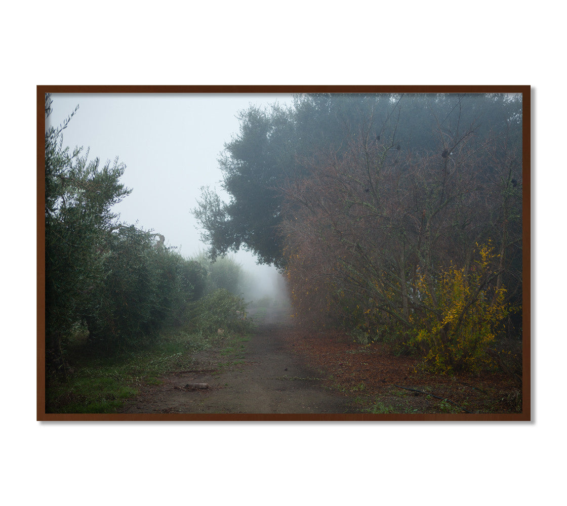 Photograph of primitive trail flanked by olive trees and a pomegranate hedge. Digital color print on Premium Matte paper.